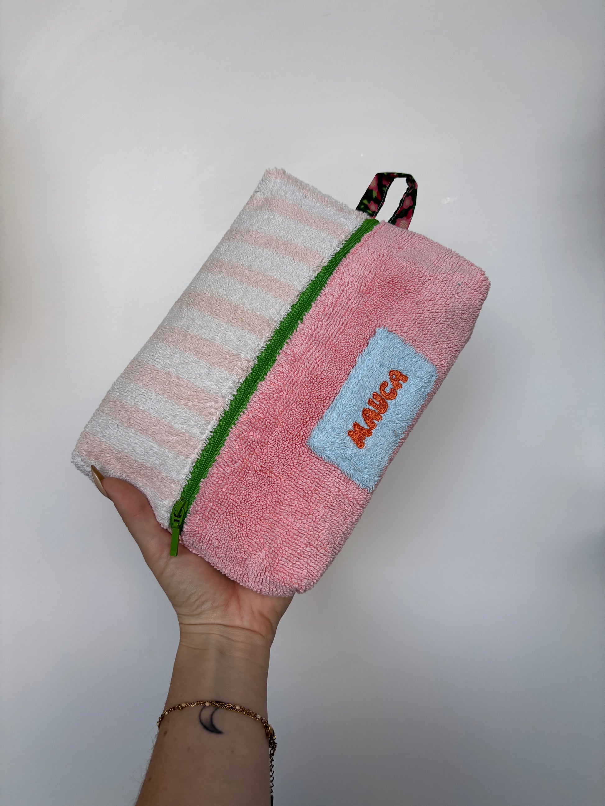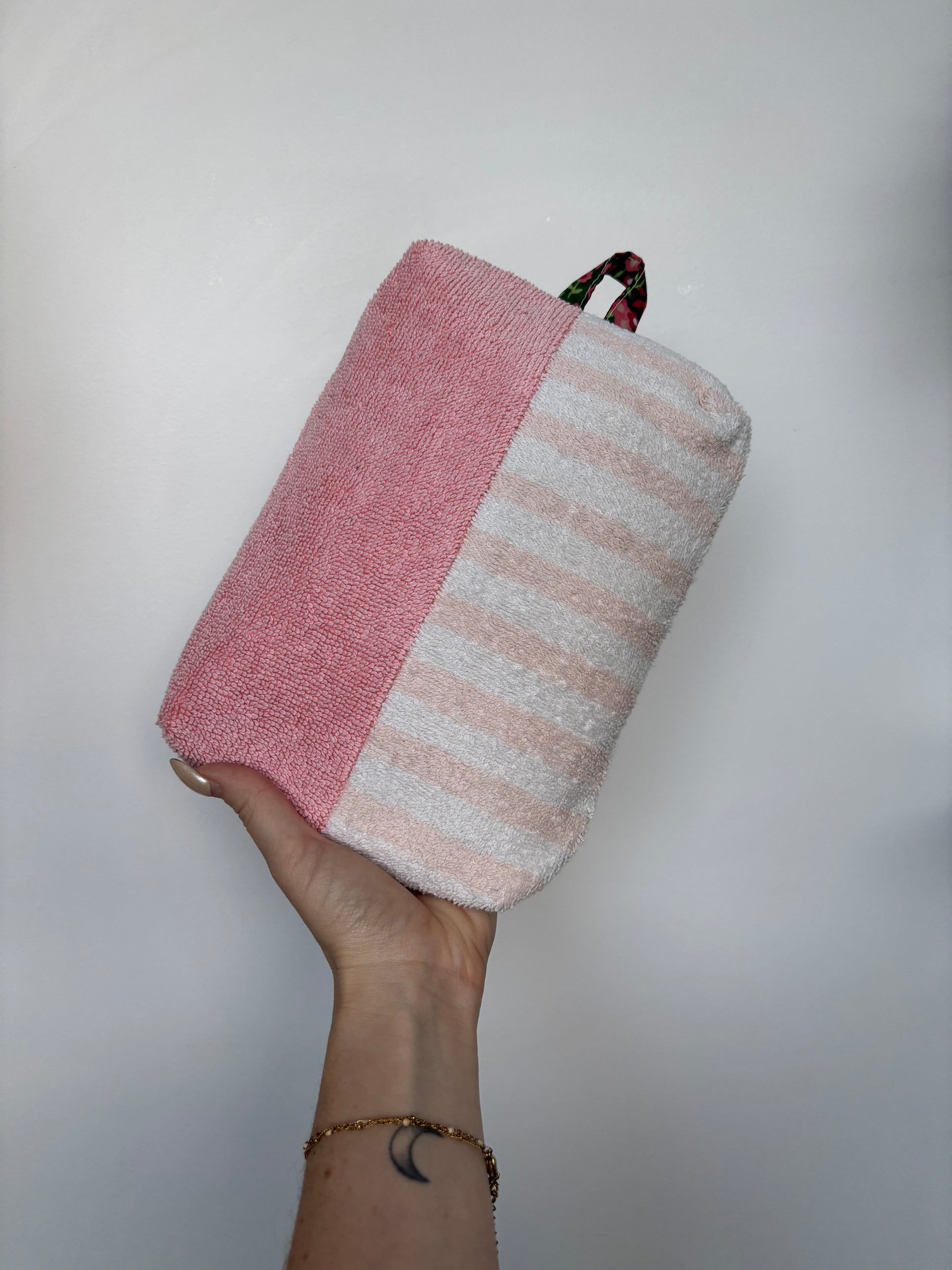 Chaque trousse est confectionnée à partir de serviettes recyclées, offrant une alternative durable aux matériaux conventionnels. La texture douce de la serviette donne à la trousse une apparence délicate tout en étant résistante à l'usure quotidienne.